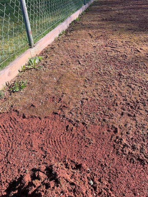 Till helgen, 2-3/5, ska det bultas m.m. Föräldrar enligt jobbschemat + styrelsen gör jobbet. Vi har tjuvstartat med mossavtagning. Ett digert och tråkigt jobb som synes. Det känns som att det blir mer mossa för varje år trots att vi bekämpar med ”salter”. Vi sållar allt vi tar upp men det försvinner mycket grus varje år ändå.